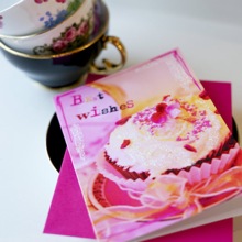 Also pictured are these scrumptious looking sparkly cards featuring original cupcakes and vintage trinkets gloss print with a ‘Best Wishes’ greeting, hand finished with iridescent glitter. Cards are blank inside and cello wrapped with contrasting fuscia envelope.